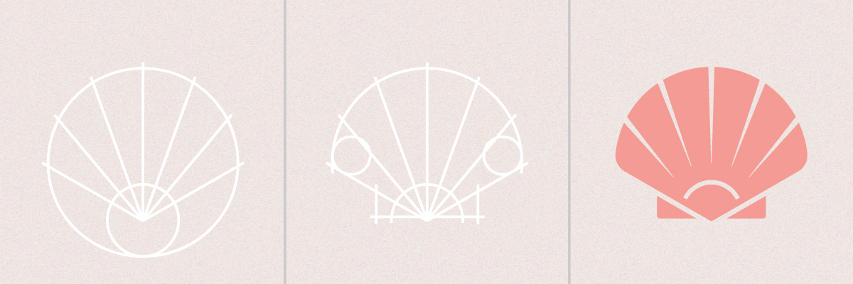 The mark is a stylized shell containing a pearl and a subtle rising sun, referencing both the Far East and Art Deco influences.